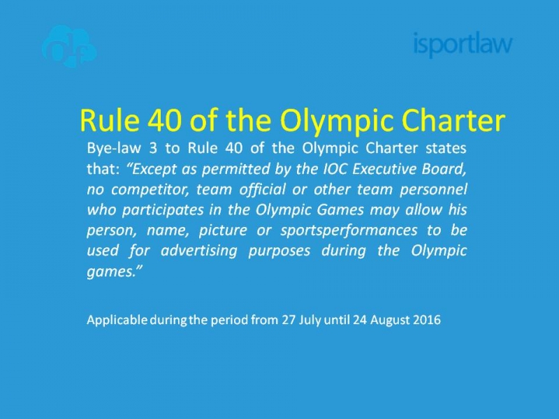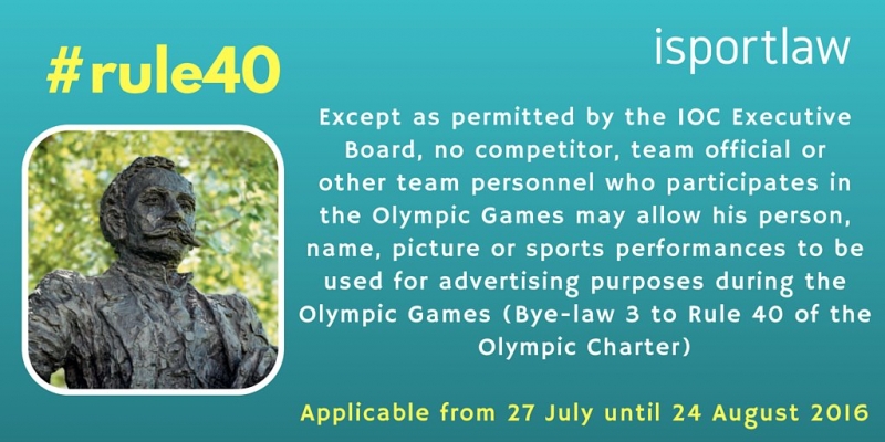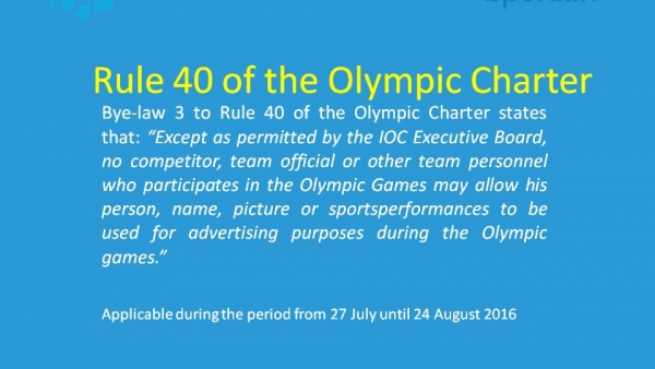 Naj omenimo, da pravilo 40 Olimpijske listine govori o uporabi podobe in imena športnikov olimpijcev ter drugih članov olimpijske reprezentance. Gre za eno izmed najpomembnejših pravil olimpijskega sponzorstva, saj opredeljuje obdobje ekskluzivnosti – obdobje olimpijskih iger, ko lahko podobo in ime športnika uporabljajo izključno olimpijski sponzorji.
